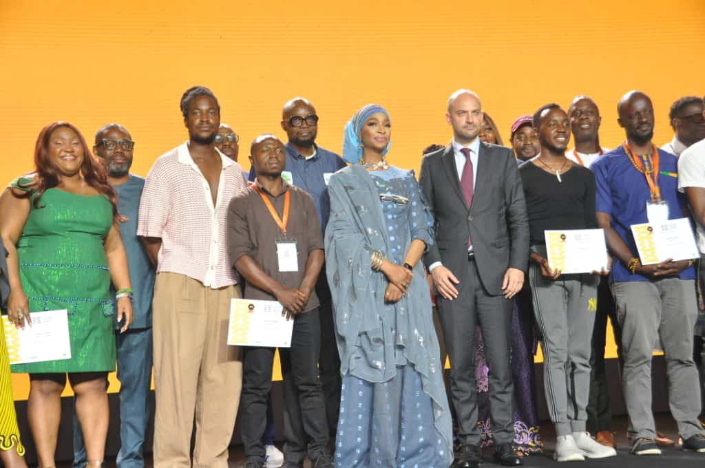 Jean Noel Barrot, French Minister for Europe and Foreign Affairs (3rd right); Hannatu Musa Musawa, Minister of Art, Culture, Tourism, and the Creative Economy in Nigeria (4th right); Louis Ibe, representative of Globacom (middle), and some winners, during the Forum CreativeAfrica Lagos, Pitching Award ceremony, sponsored by Globacom, in Lagos on Friday.