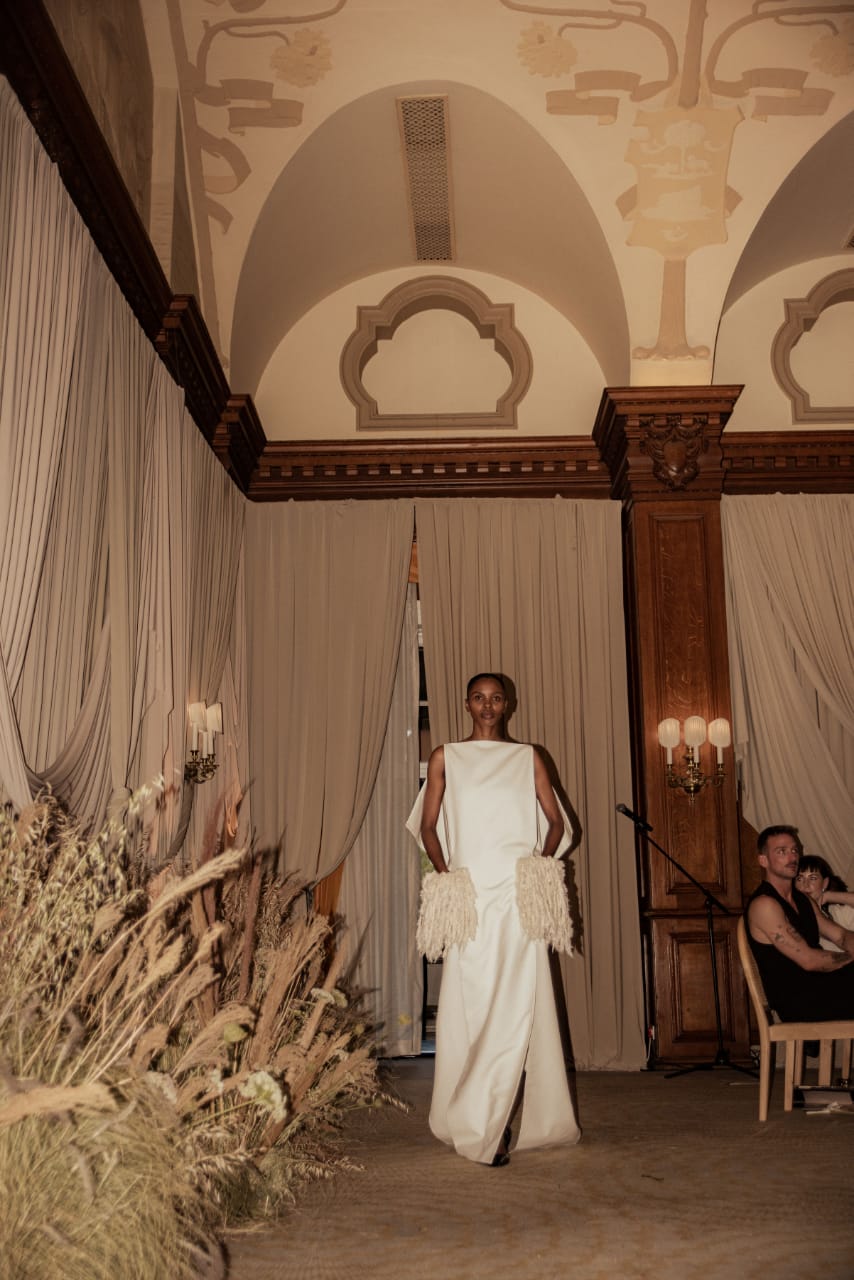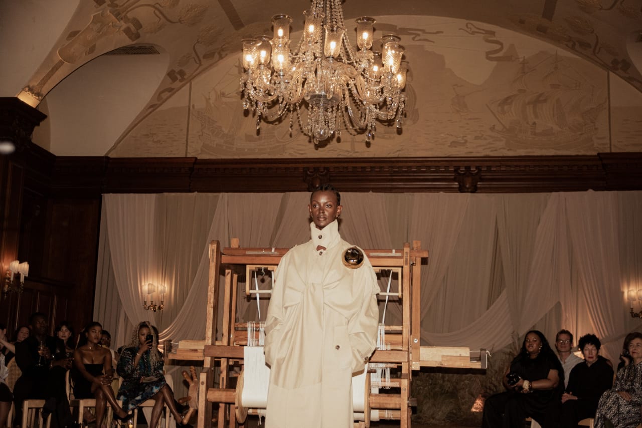 The second Act, Threads, saw Azzedine Alaïa Foundation x Orveda Prize winner UNI FORM by Luke Radloff reveal the true slow nature of garment-making and craftsmanship. Tailored pieces, reimagined through a distinctly South African lens, took centre stage, highlighting the meticulous process of hand-spinning thread into fabric. The fashion showcase was brought to life with a live installation by master weaver Tivane Mavuma of Barrydale Hand Weavers and soundscape performance by Muneyi, with the vision of the show supported by UNI FORM creative director Bee Diamondhead. “The collection speaks to emotional tailoring, encompassing the toll it takes to create with intention in our world,” says Radloff. “It may appear effortless from the outside, but we want to show the care and investment required to bring each garment to its finished form.”
