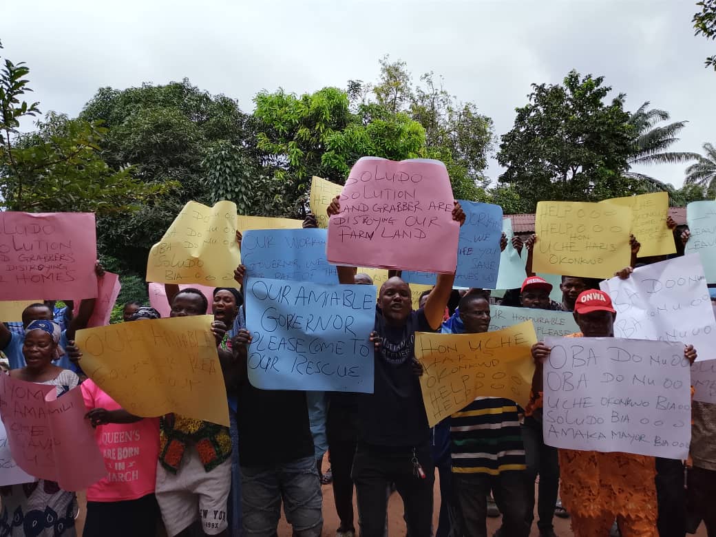The protesters, who looked visibly unhappy, bore placards with the inscriptions, such as ‘Soludo come to our rescue’, ‘We have no other place call our own land’, ‘Bukham Group in collaboration with few of our sons have sold some plots of our land’, ‘We can’t be tenants in our own land’, ‘They have destroyed our buildings, farmland’, among others.