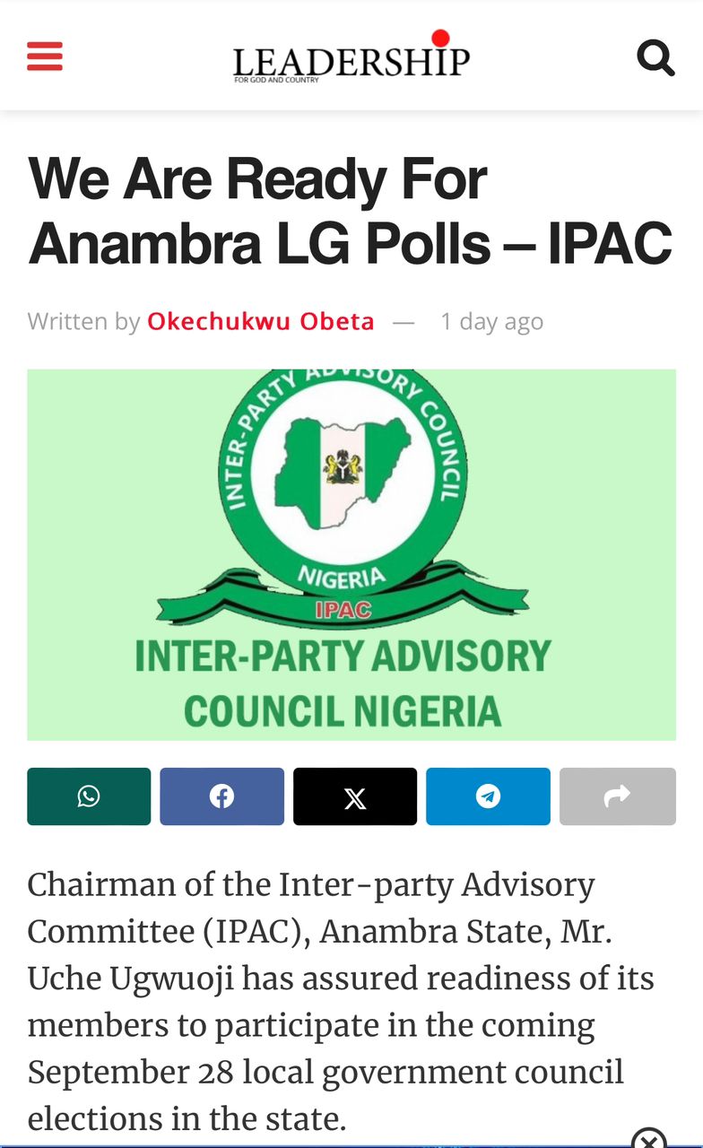This is coming days after some jittery persons in the State had called a press conference threatening to derail the democratic process of electing leaders in the third tier of government. IPAC has not only declared to participate in the electoral process, but has expressed implicit confidence in the capacity of the Anambra State Independent Electoral Commission (ANSIEC) to conduct a free, fair and credible election.