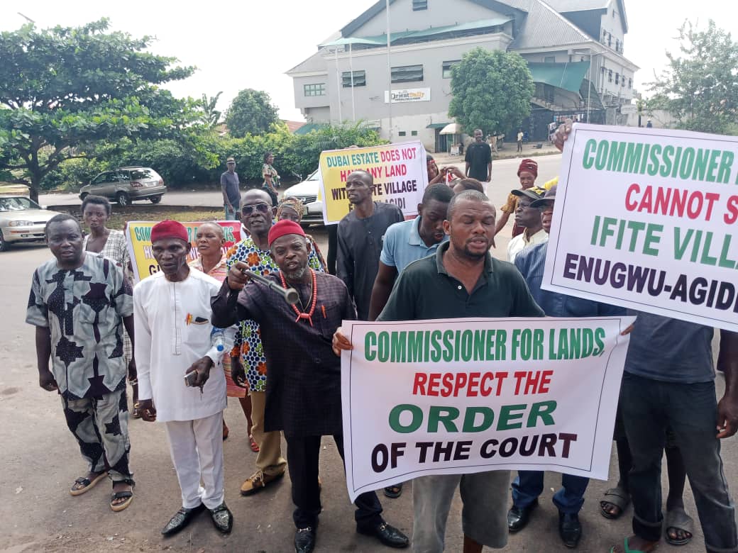 Other inscriptions on the placards include “Commissioner for Land, Respect the Order of the Court”, “Commissioner for Land Cannot Sell Ifite Village Enugwu-Agidi Land”, “Dubai Estate Has Not Secured Any Land within Ifite Village, Enugwu-Agidi”, “Members of Ifite Village Enugwu-Agidi Are Law-abiding Citizens”, “G.S.S. Obey the Court Order”, “Trans-Obibia Layout of Enugwu-Agidi Does Not Belong to Any Estate Developer”, among other such inscriptions.