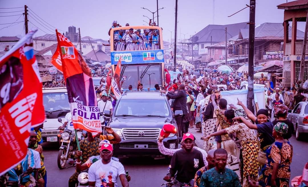 The presence of the candidate electrified the elated crowd, which danced to campaign songs. Waving to the crowd, Tinubu also danced as he moved around the podium along with the APC governorship candidate in the state, Senator Teslim Folarin, and other party leaders.