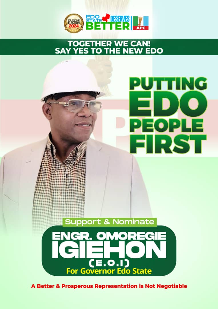 As the countdown to February 17, 2024 gubernatorial primaries of All Progressive Congress in Edo State begins, a top aspirant, Engineer Omoregie Igiehon has assured Edo citizens of his commitment to total development of the state if he emerge victorious at the APC primaries and eventually triumphed at the general election.