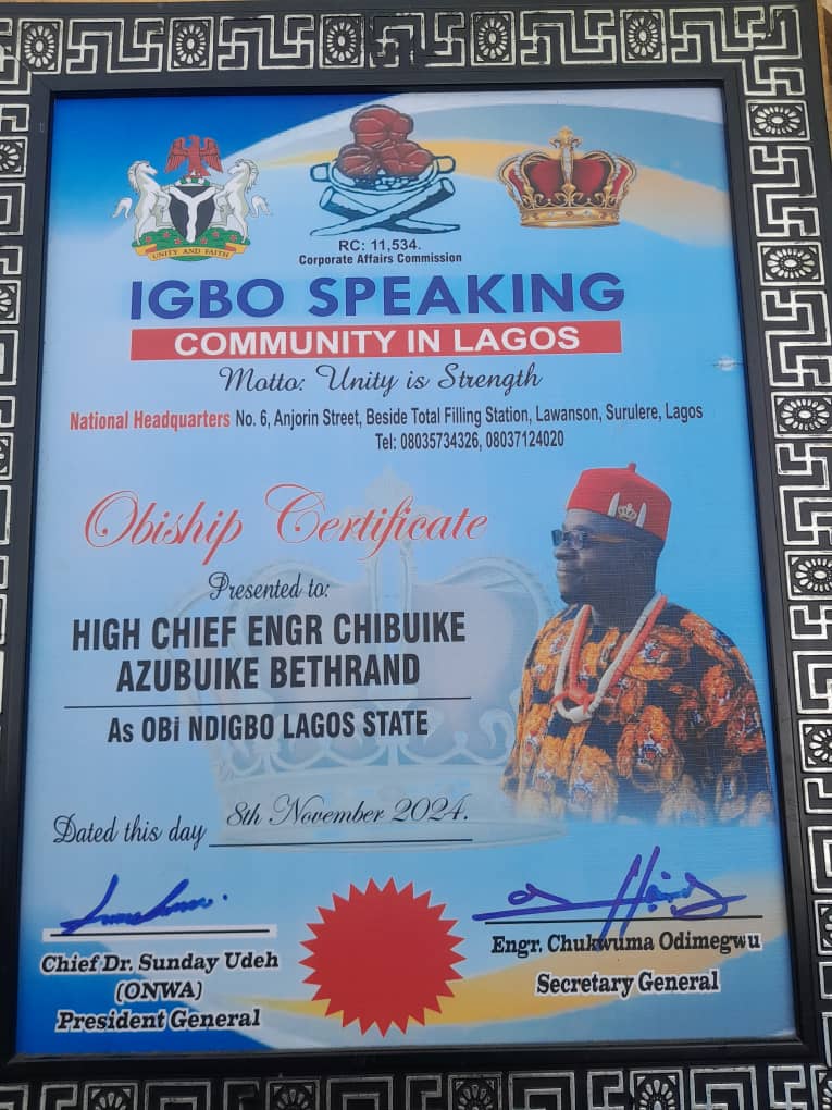 He stated that Chief Udeh even denied that he does not know his house, where he came with some members of his Executives and elders of the Igbo Speaking Community to crown and issue him a certificate dated 8th November, 2024, duly signed by Udeh and his General Secretary, Engr. Chucks Odimegwu.