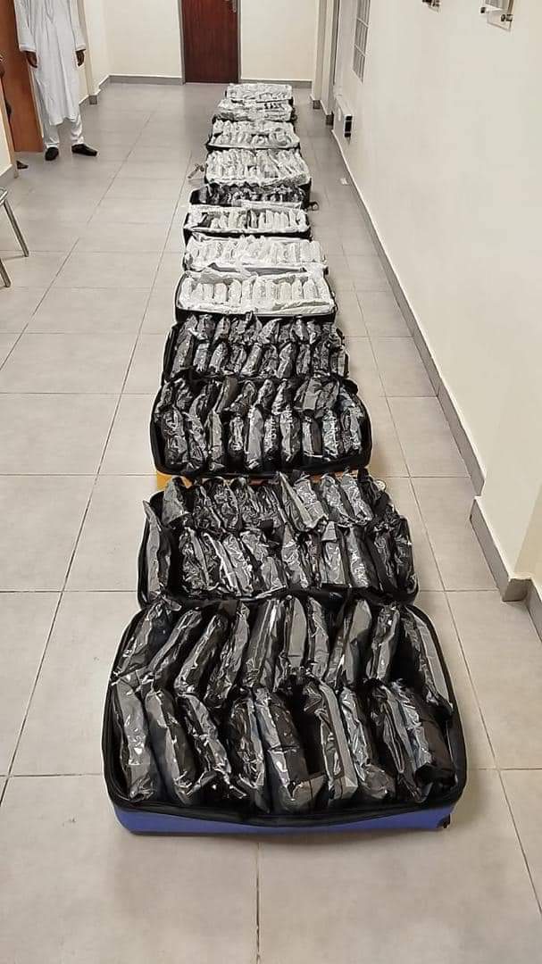 The consignment estimated to be worth N960,000,000.00, which was brought in by a passenger, Ughenu Nnaife Francis was discovered at the E-arrival hall of the airport by personnel of NDLEA, Customs and others during a joint search operation by the security operatives while the suspect was attempting to smuggle the suitcases out of the hall.