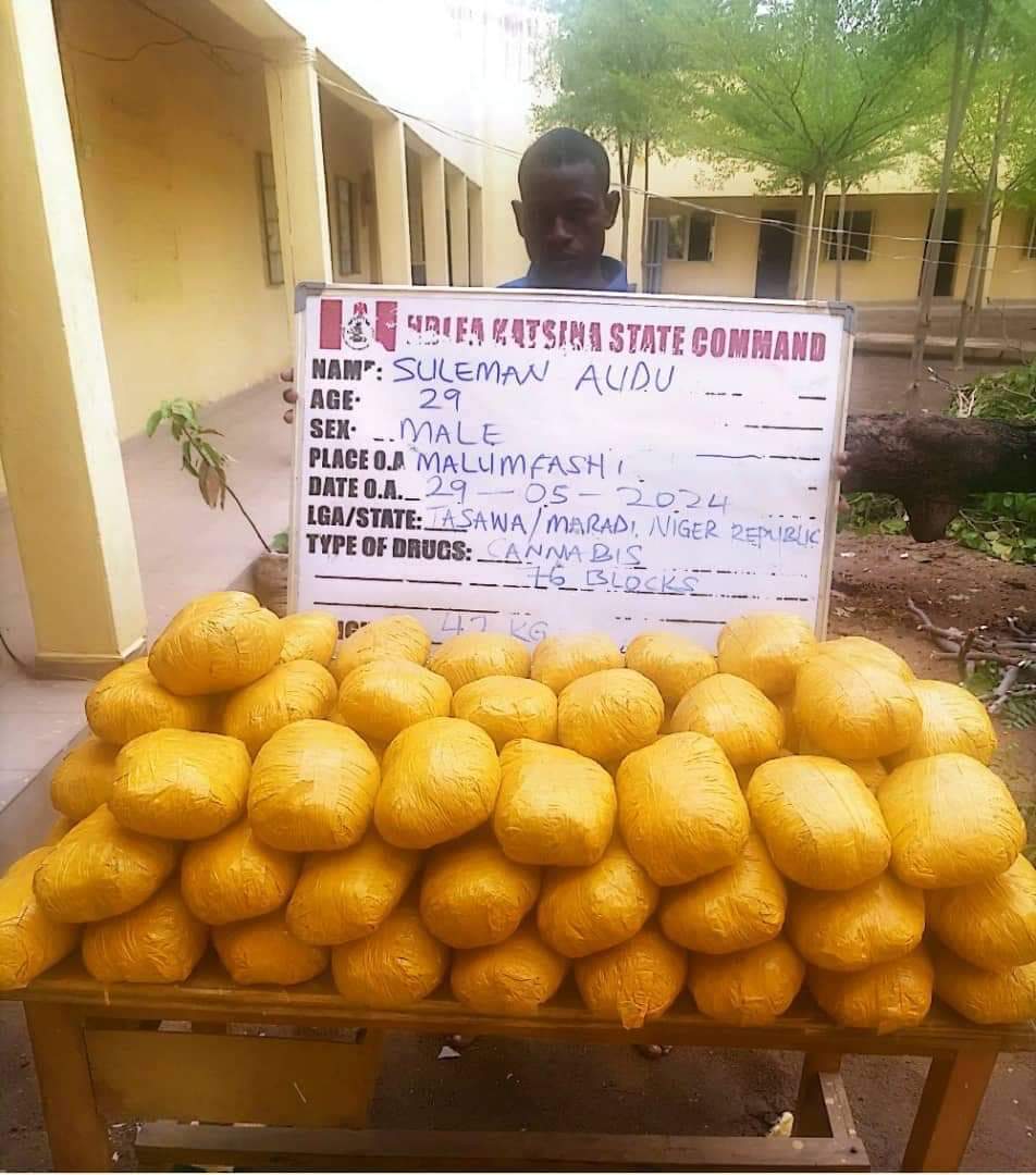 In Katsina state,76 blocks of cannabis weighing 42kg were seized from a Nigerien, Suleman Audu, 29, when he was arrested by NDLEA officers along Zaria – Malumfashi road on Wednesday 29th May.