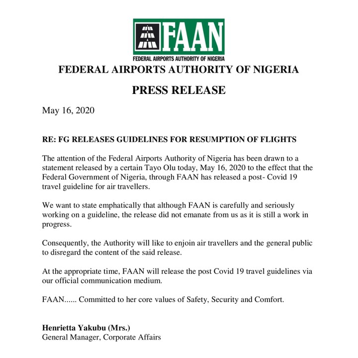 FAAN in the statement issued declared: “The attention of the Federal Airports Authority of Nigeria has been drawn to a statement released by a certain Tayo Olu today, May 16, 2020 to the effect that the Federal Government of Nigeria, through FAAN has released a post-COVID 19 travel guideline for air travellers.