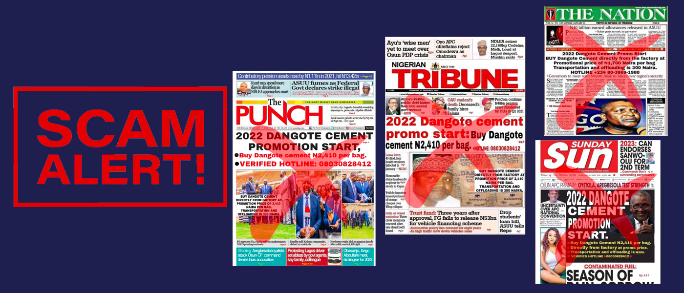 A statement Monday signed by Mr. Anthony Chiejina, Group Chief Branding & Communications Officer, Dangote Industries Limited (DIL) reads: “Our attention has been drawn to some recent reports tagged ‘2022 DANGOTE CEMENT PROMO START’ purportedly published on the front pages of some national dailies.