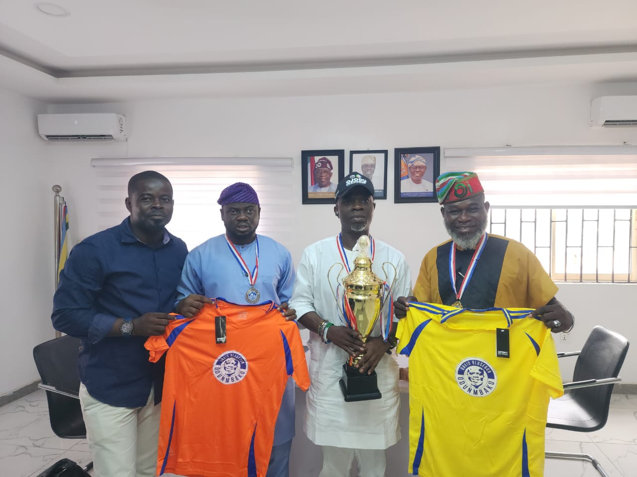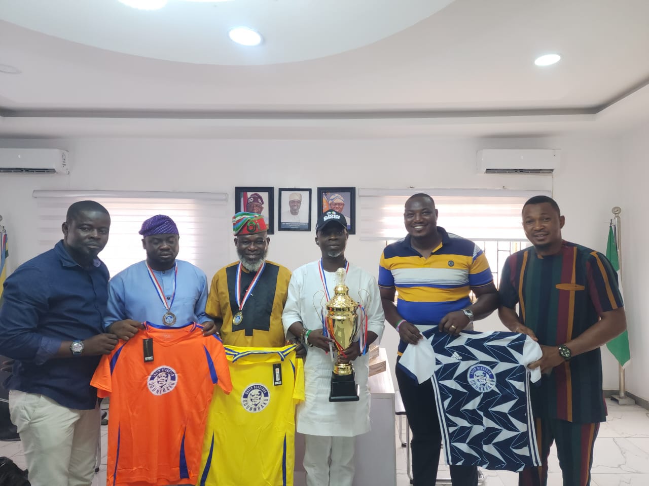 In preparation for the much-anticipated DOS Mega Football Cup Final, the Local Organizing Committee (LOC) of the tournament paid a courtesy visit to the Executive Chairman of Ojodu LCDA, Lagos State, Hon Segun Odunmbaku, to formally present the medals and jerseys for the championship match.