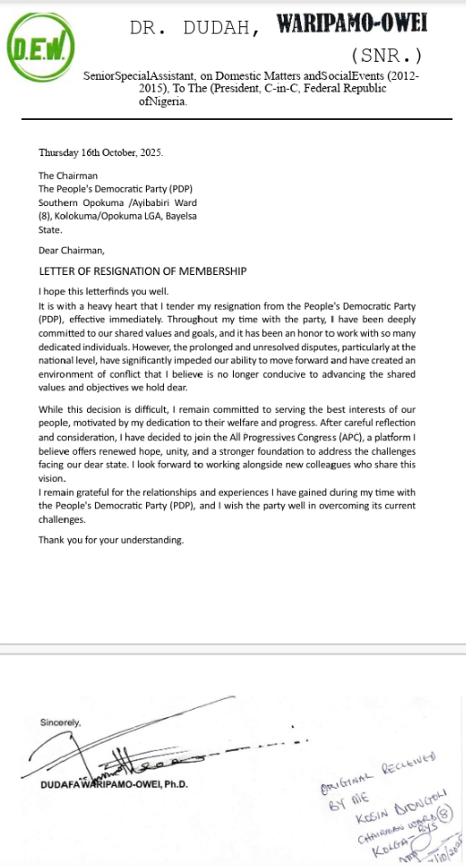 Dr. Dudafa, a former member of the Bayelsa State House of Assembly, made the announcement in a statement dated October 16, 2025, and address to the Chairman, People’s Democratic Party (PDP), Southern Opokuma/Ayibabiri Ward 8 in Kolokuma Opukuma local government area of the state.