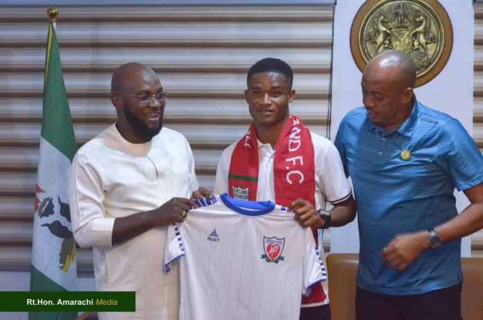 Unveiling the Heartland Football Club 2021|2022 Season’s first acquisition at the residence of Imo Deputy Speaker and House Committee Chairman on Youth, Sports & Entrepreneurship, Rt. Hon Amara Chyna Iwuanyanwu, Mr. Solomon Muhrinho, a sports journalist and radio presenter with Hot FM Owerri, with the expressed permission of the General Manager of the Club, Mr. Promise Nwachukwu, presented the Ideato – South born striker to Imo people as the football community and numerous supporters of Heartland FC are looking forward to watching his debut match with his new club.