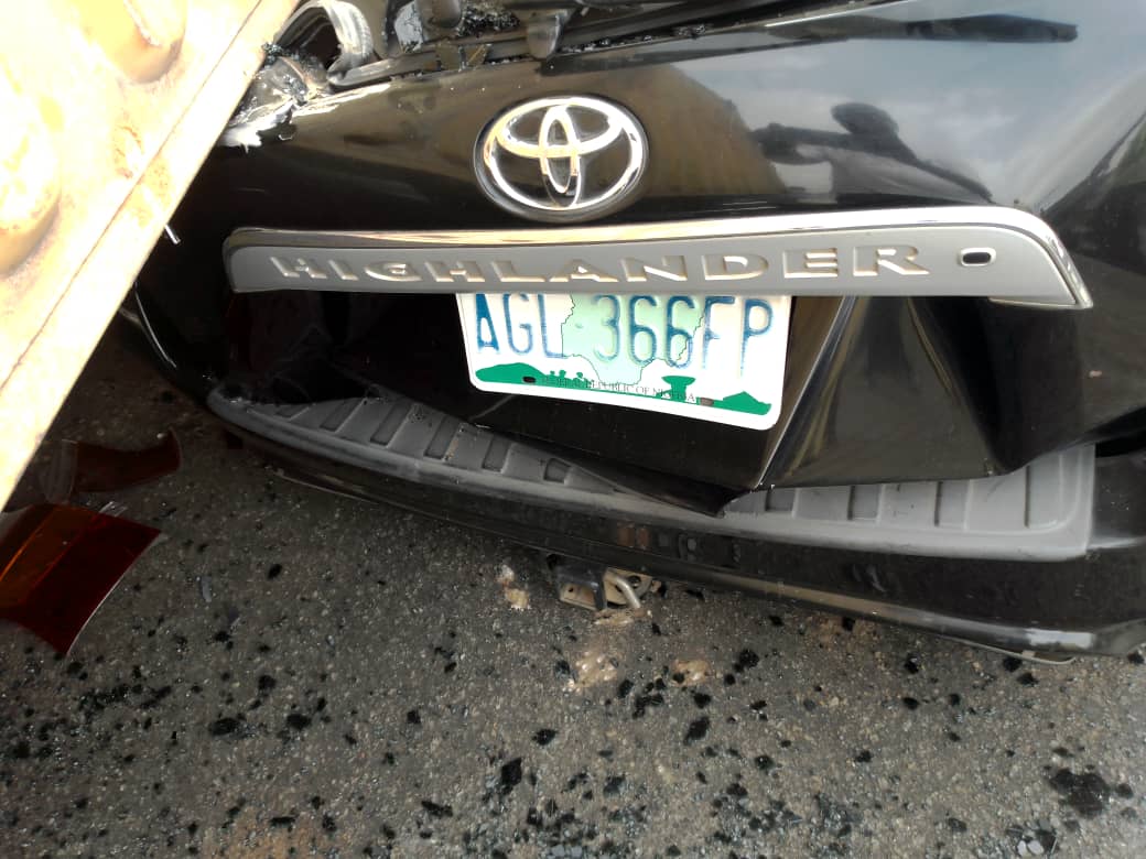 P.M.EXPRESS reports that the accident happened around 1:09pm on Thursday and the driver of a commercial bus with registration number (AKD 469 XZ) died instantly with two other private cars involved in the accident (Toyota Highlander AGL 366 FP & Toyota 4Runner AAA 353 FH).