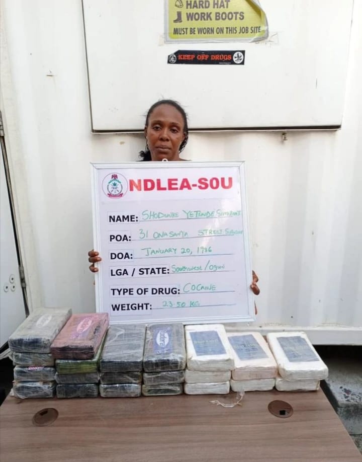 “A thorough search of her home led to the discovery of blocks of cocaine weighing 23.50 kilograms concealed in a black suitcase recovered from her children’s room. She admitted ownership of the drug consignment worth over N5billion in street value” the NDLEA stated.