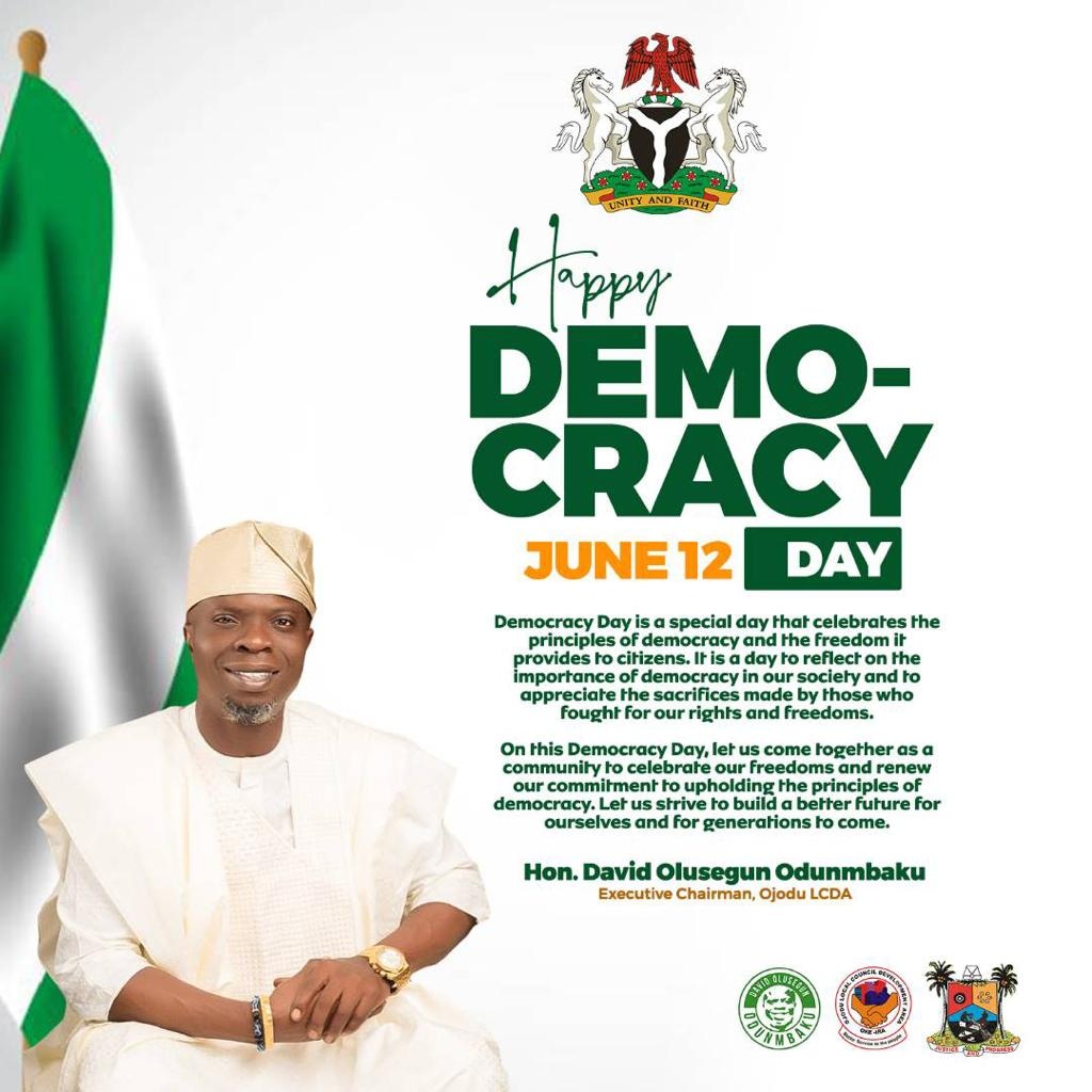 In his message on Democracy Day, the Ojodu Mayor, Odunmbaku said, “Dear Residents of Ojodu LCDA, Happy Democracy Day!”