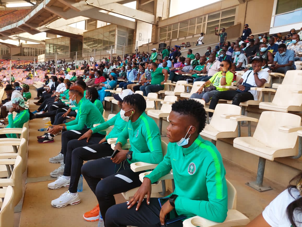 Members of senior national women’s team, the Super Falcons watching their juniors, Falconets against Cameroon in Abuja on Saturday