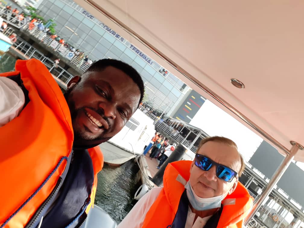 Technical Adviser Gernot Rohr and Media Officer Babafemi Raji just before take-off from the jetty in Lago
