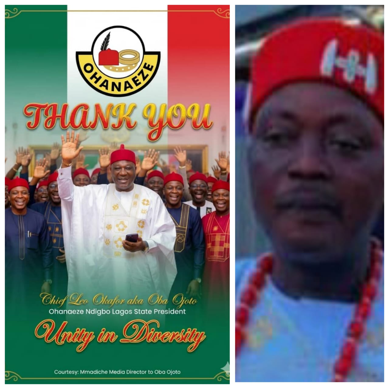 He state: “I, Chief Emmanuel Ubah, Otunba Ojoto, wish to congratulate my brother, the newly elected President of Ohanaeze Ndigbo Lagos State, Chief Leo Okafor, (Oba Ojoto), on his victory. Your emergence is a victory for unity and progress of Ndigbo in Lagos State”.