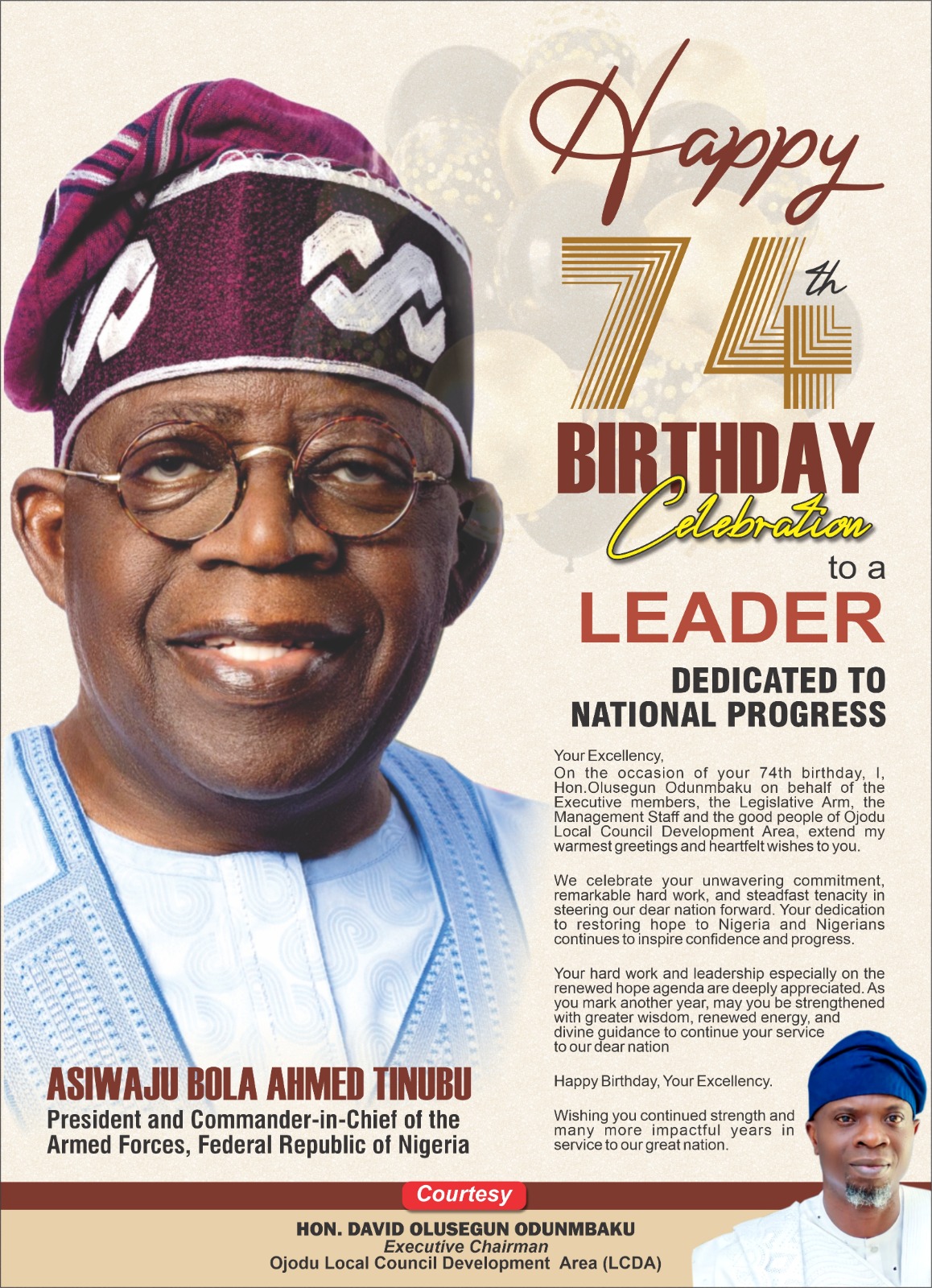 The Executive Chairman of Ojodu Local Council Development Area, Lagos State, Hon Segun Odunmbaku, has felicitated with President Bola Tinubu GCFR on his 74th birthday while commending his leadership qualities and achievements as a visionary and exemplary leader.