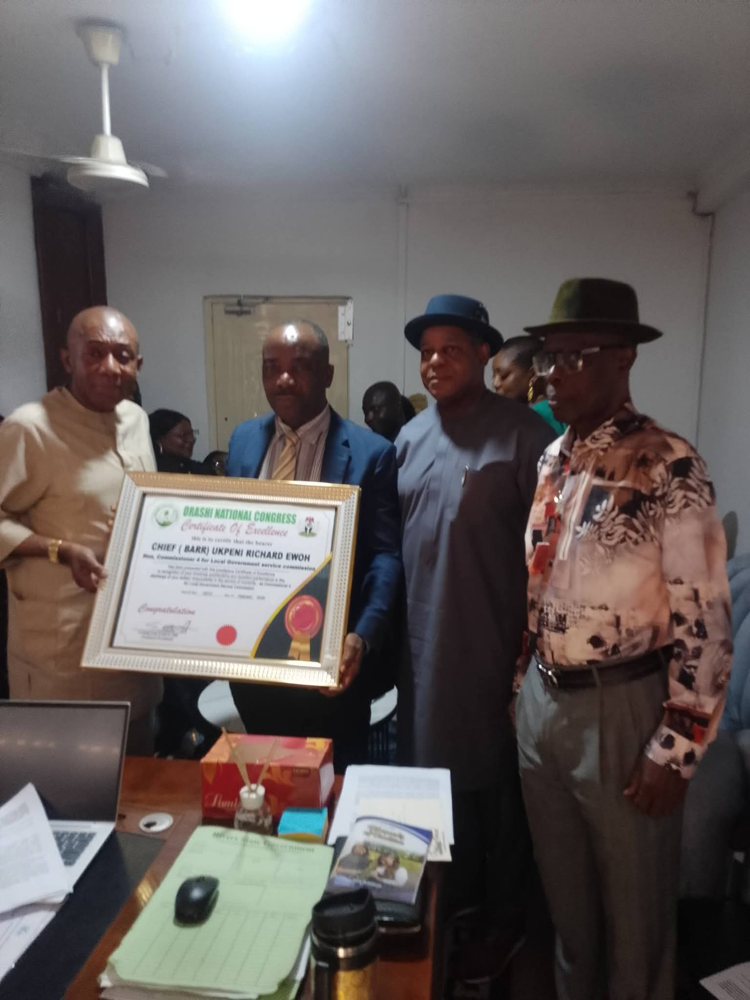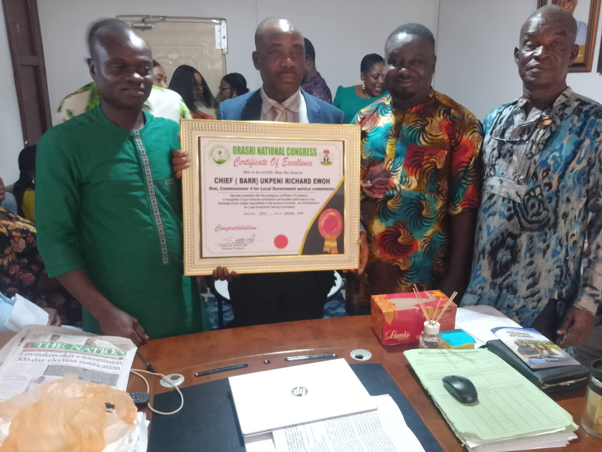 Notable Niger Delta socio-cultural group, the Orashi National Congress, ONC, has honoured the Honourable Commissioner Four, Hon. Chief (Barr.) Ukpeni Richard Ewoh, MFE, FCPA, with Excellence Award.