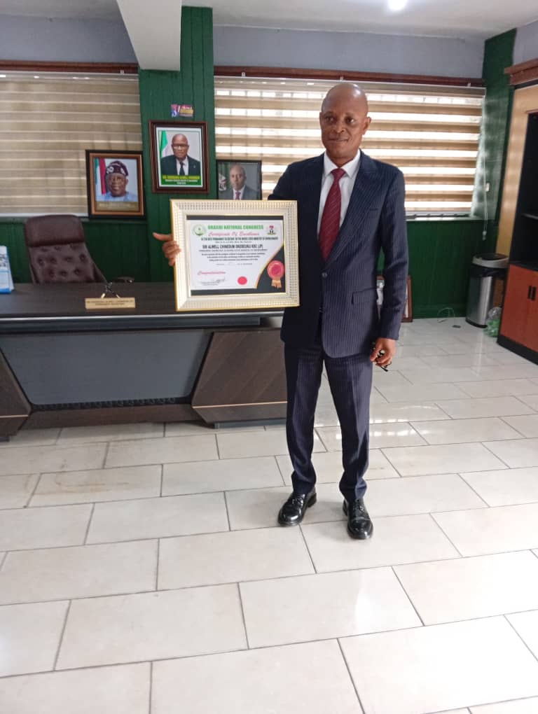 “We are here to commend you for the good work you have been doing as Permanent Secretary, Rivers State Ministry of Environment, and to honour you, Sir Alwell Chinedum Okereuku KSC, JP, with a Certificate of Excellence as the Best Permanent Secretary in our beloved Rivers State. It may interest you to note that this award follows a comprehensive assessment of your performance, administration efficiency, and distinguished contributions to environmental governance in the state. This recognition is the outcome of a critical evaluation conducted by an independent assessment committee within the Congress. The Committee reviewed the achievements of individuals who have served in different ministries and concluded that your impact stands out remarkably. This is our own way of celebrating excellence and encourage a culture of accountability and dedication in public service. We applaud your track record and exemplary leadership which has significantly contributed to the advancement of the Ministry. Let me therefore, present to you the certificate to the Glory of God.”