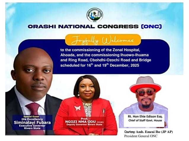 Notable Niger Delta socio-cultural group, the Orashi National Congress (ONC) has warmly welcomed the Executive Governor of Rivers State, His Excellency, Sir Siminalayi Fubara, DSSRS, to Ahoada East Local Government Area ahead of the commissioning of the Obohdhi–Ozochi Road and Bridge scheduled for Wednesday, 17th December, 2025.