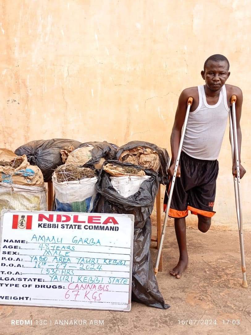 Not less than 4.5kg of the same substance concealed inside the door panels and boot of an imported Toyota RAV 4 vehicle was on Sunday 14th July recovered from a container marked MSDU 5656394 from Canada during a 100% search of the container at Tincan port in Lagos. Two suspects: Dada Kole and Alaba Oladewusi have been arrested in connection with the seizure. Meanwhile, a 48-year-old one legged man, Amadu Garba was arrested by NDLEA operatives in his house at Yawuri town, Kebbi State with six bags of cannabis weighing 67kg on Tuesday 16th July.