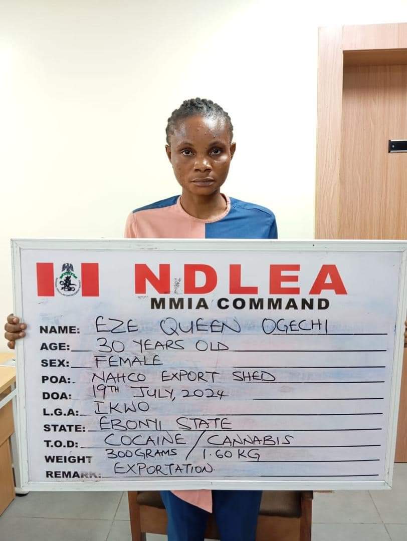 In the same vein, NDLEA operatives at the NAHCO export shed of the MMIA on Friday 19th July intercepted two jumbo bags going to Pakistan. The bags contained dried hibiscus leaves, dried bitter leaves and other food items, which were used to conceal four parcels of cocaine and 14 parcels of Loud, both weighing 1.360kg. Further investigations led to the arrest of a businesswoman, Eze Queen Ogechi who claimed she was sending the illicit consignment to Pakistan on the instruction of her brother, Eze Nnamdi Promise based in the South Asia country.