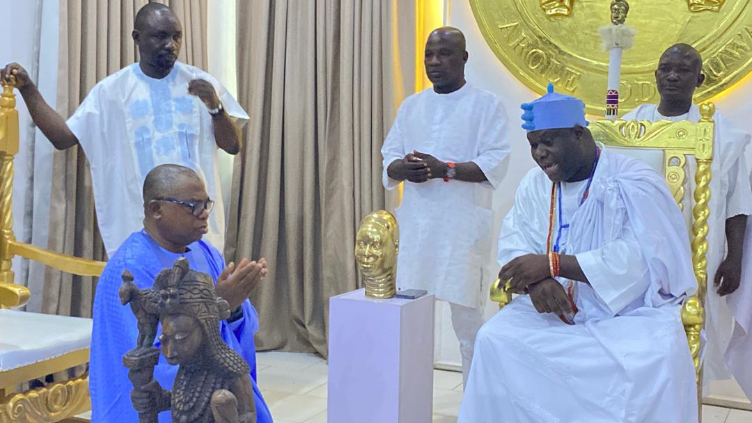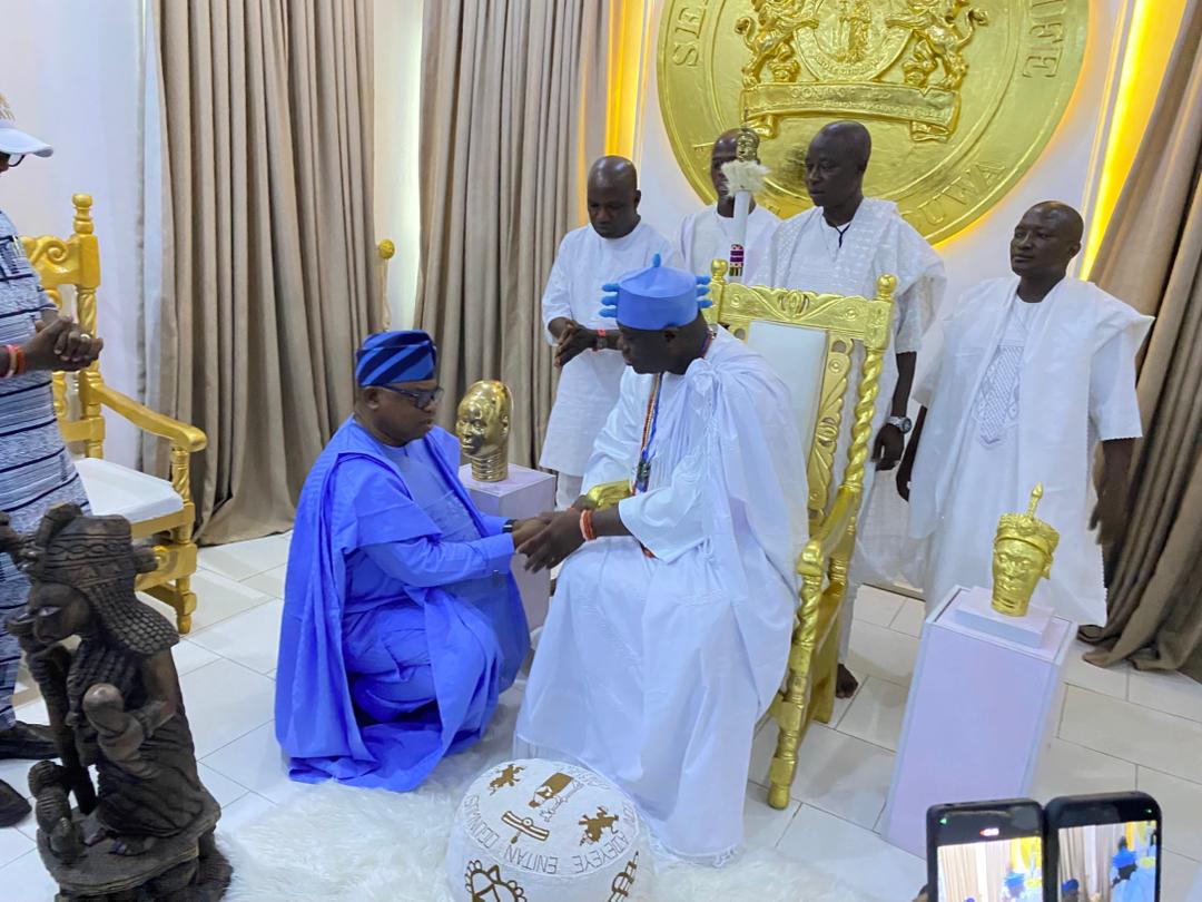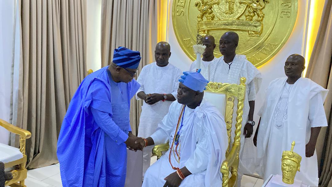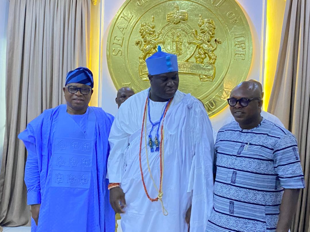 The Permanent Chairman of the Southern Nigerian Traditional Rulers Council (SNTRC), Arole Oodua Olofin Adimula and the Natural Head of the Oduduwa race worldwide, the Ooni of Ife, Ooni Adeyeye Enitan Ogunwusi, CFR, Ojaja II, has hosted the All Progressives Congress (APC) governorship candidate in Osun State, Bola Oyebamiji, popularly known as AMBO, at the revered Ile Oodua Palace in Ile-Ife.