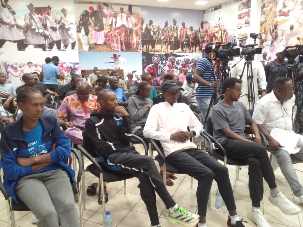 Some of the dignitaries at the press conference held at the Exhibition Pavilion of the Department of Arts and Culture, Social Development Secretariat in Abuja included Mr Lucas Istifanus, Director of Sports, FCT; Mrs Grace Awe, Director, Department of Arts and Culture, FCT; Mrs Asabe Umar, Director of Youth, FCT, and Mrs Joyce Bozimo, Organiser of the Warri/Peace Marathon.