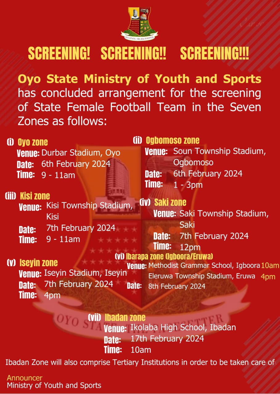The screening exercise for Oyo Zone will take place on, Tuesday at Durbar Stadium Oyo, between 9am and 11am, while at Ogbomoso Zone will be held at Soun Township Stadium from 1pm to 3pm same day.