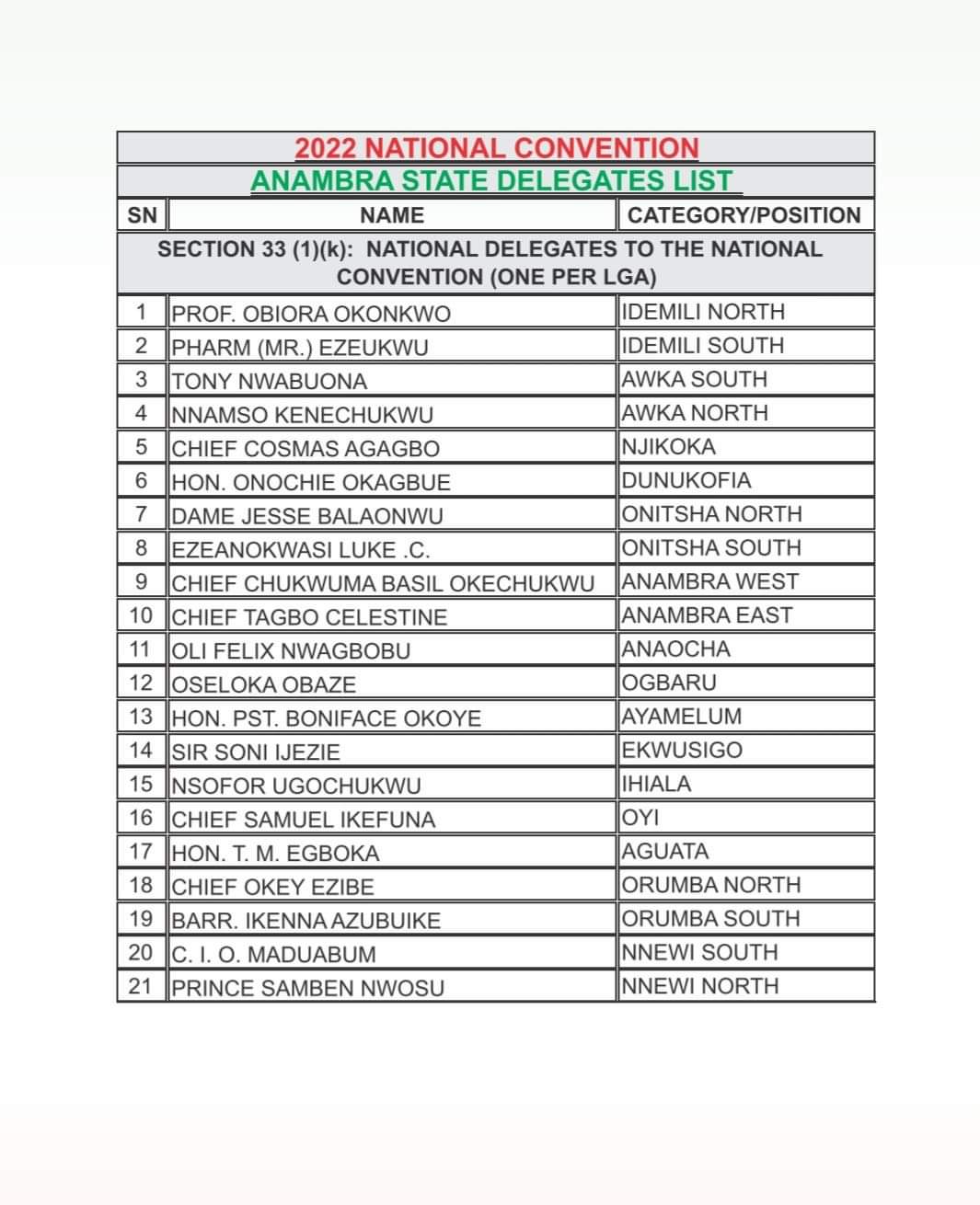 The Anambra National delegates were 21 in number as elected in the various LGAs. To the much I know, their positions were never in contest. In my LGA, Njikoka, we elected Chief Cosmos Agagbo, Okpokaji Na Abba as our National Delegate.