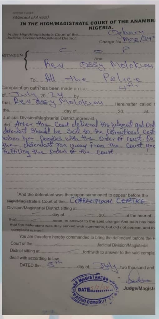 The arrest warrant, dated July 5, 2024, directed the Nigerian Police Force, through the State Commissioner of Police, to arrest Rev. Ossy Molokwu on sight if he does not submit himself to the Correctional Center, Onitsha.