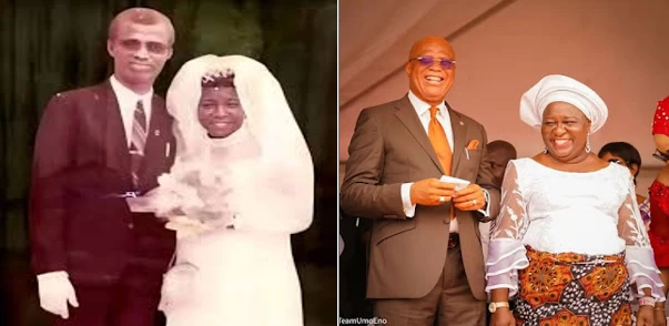 L-R: Young Eno was 22 years old, and Patience was 19 when they got married in 1986. At a state event, this was their last outing as husband and wife in Akwa Ibom State in 2024.