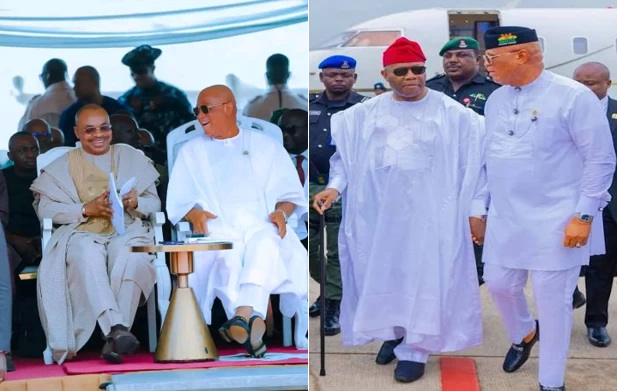 Gov. Umo Bassey Eno with his immediate predecessor, Udom Gabriel Emmanuel, and past governor, now Senate President Godswill Obot Akpabio