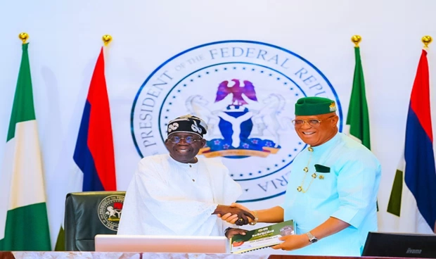 Gov. Umo Bassey Eno with President Bola Ahmed Tinubu after he defected from the PDP to the APC