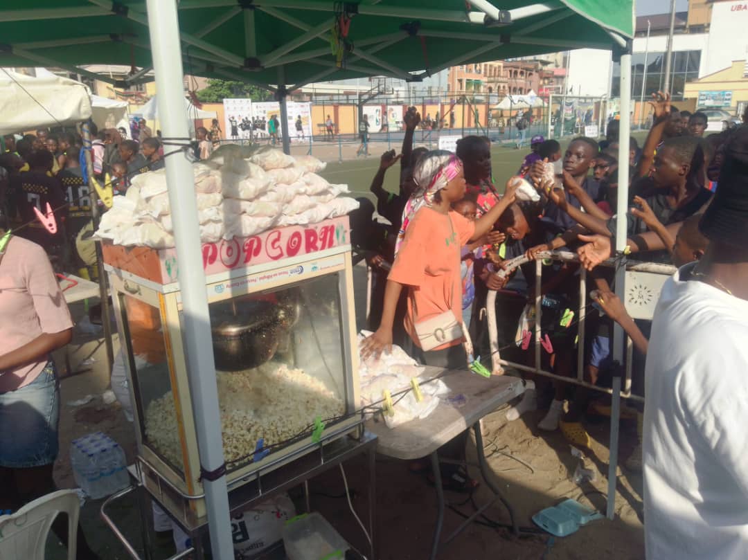 Kids receiving delicious popcorn at a corner at Campos stadium.