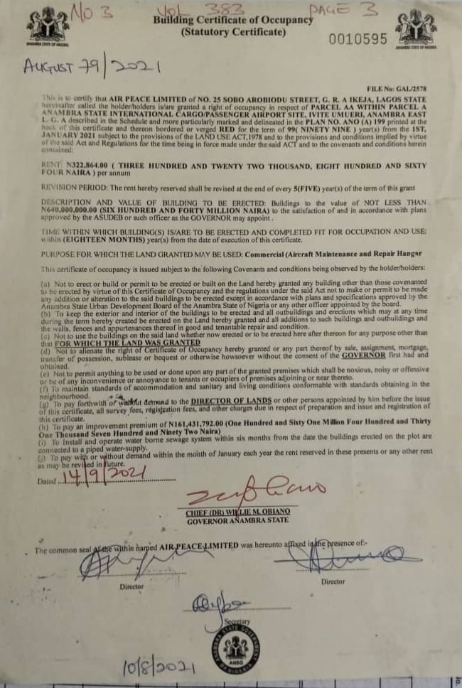 2. Governor Willie Obiano, who placed great importance on attracting investors, directed the then Commissioner for Lands, Hon. Bonaventure Enemali, to treat Air Peace’s application with utmost priority.