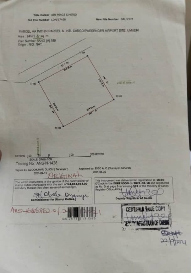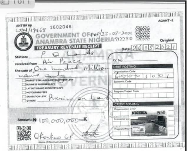 4. In line with the State’s official “scale of fees,” the cost of the land was computed at ₦100 million, which Air Peace duly paid. (Receipt attached.)
