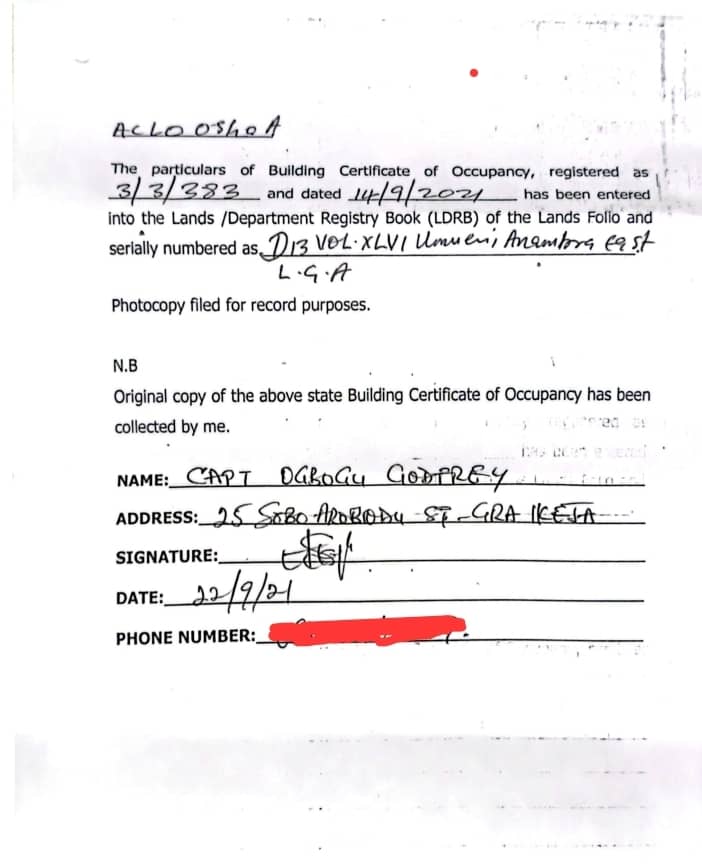 5. The Certificate of Occupancy (CofO) was promptly processed and signed by Governor Obiano on September 14, 2021. (Copy of CofO attached.)