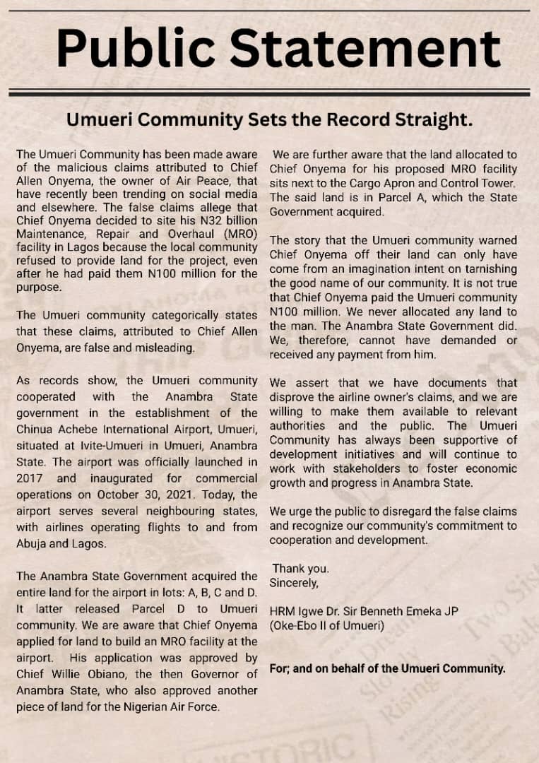 10. To further clear the air, HRH Igwe Ben Emeka of Umueri publicly issued a statement debunking the false claim that his community obstructed Air Peace’s project. (Copy of the published statement attached.)