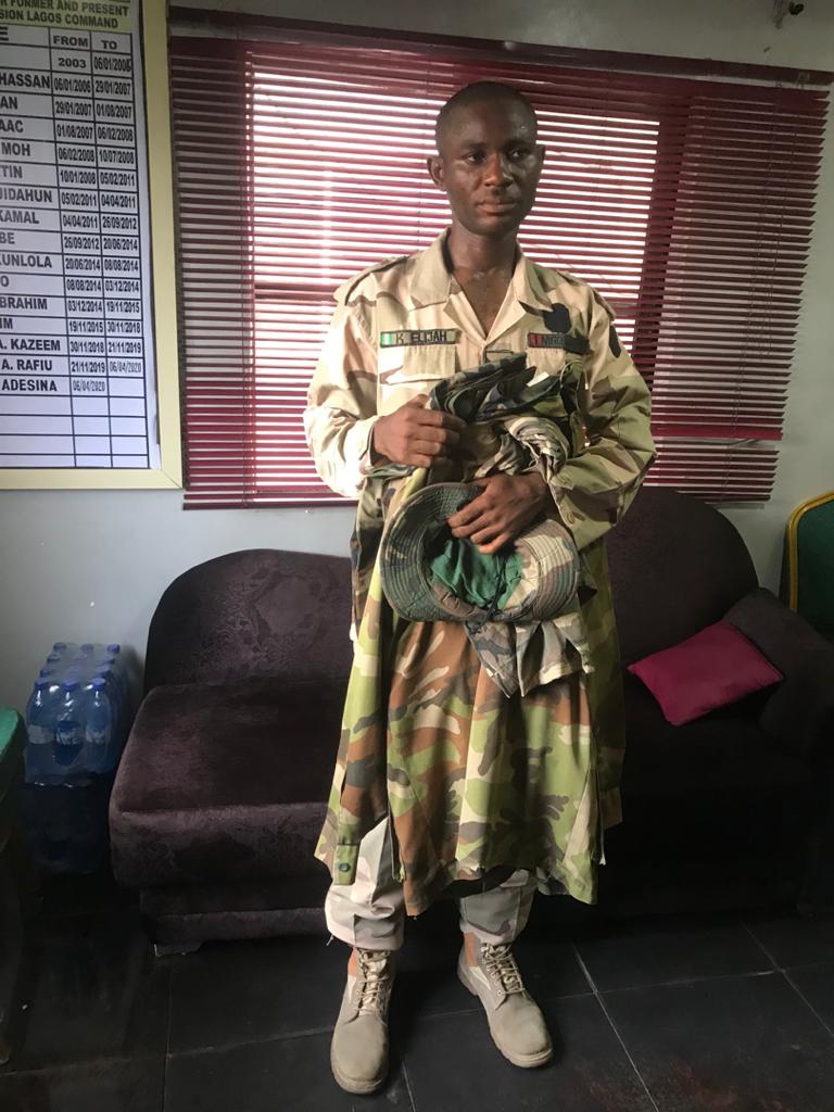 He said that on 16th May, 2020, at about 1500 hours, detectives from Ilemba Hausa Police Station arrested one Kehinde Elijah “m”  45 of Ibiyeye Street, Whitehouse Bus Stop, Okokomaiko. He said he was among three suspects on Police wanted list for violent crimes. Four pairs of military fatigues were recovered from his house. He claimed to have deserted the Military in 2015 when he was deployed to the North East to fight insurgency. He has been in Ojo area since then, where he has been terrorizing members of the public.