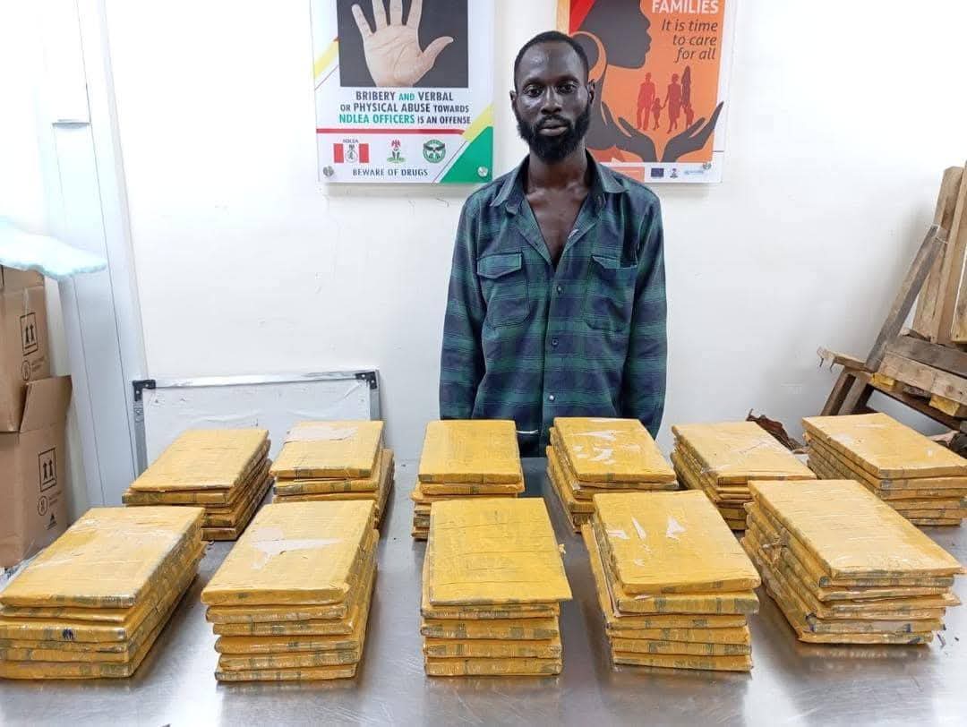 Another bid by a drug trafficking syndicate to ship 68 parcels of Ghanaian Loud with a total weight of 42.2kg concealed in walls of crated cartons to London, UK, through the export shed of the Lagos airport was also frustrated by NDLEA officers on Friday 21st February. Three suspects: a freight agent and two dispatch riders were initially arrested in connection with the seizure before the mastermind of the shipment, Samuel Bitris, was swiftly traced to his Exodus Estate, Ajah, Lagos home, where he was arrested.