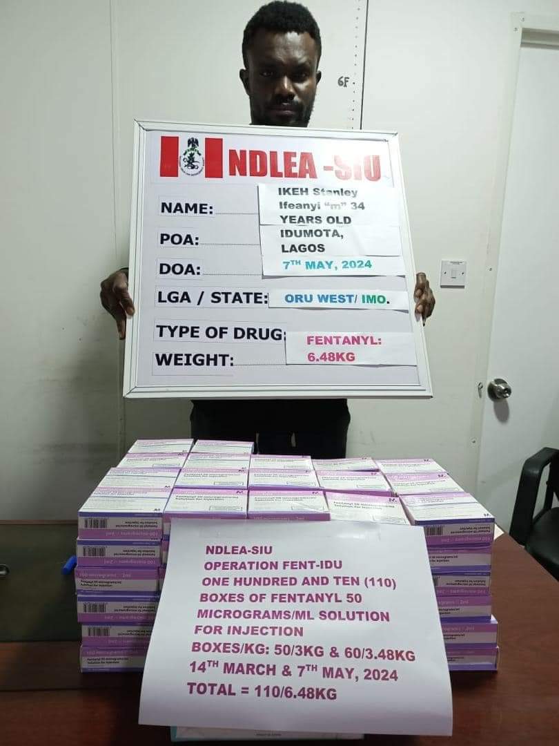 Another kingpin who was put behind bars is 34-year-old Ikeh Stanley Ifeanyi who was arrested at the popular Idumota market in Lagos Island, where no fewer than 1,100 ampoules of lethal synthetic opioid, fentanyl, weighing 6.480kg were recovered from him. The dangerous opioid is 100 times more potent than heroin and currently responsible for over 70% overdose deaths as well as a major contributor to fatal and nonfatal overdoses in the US.